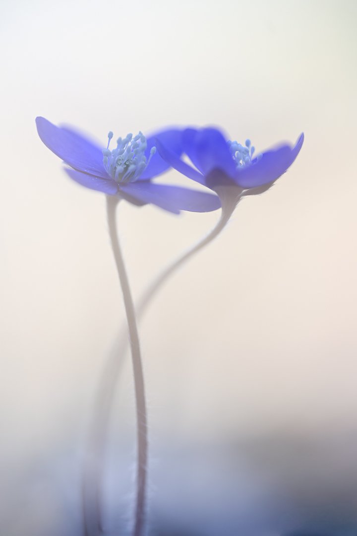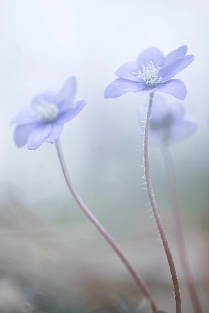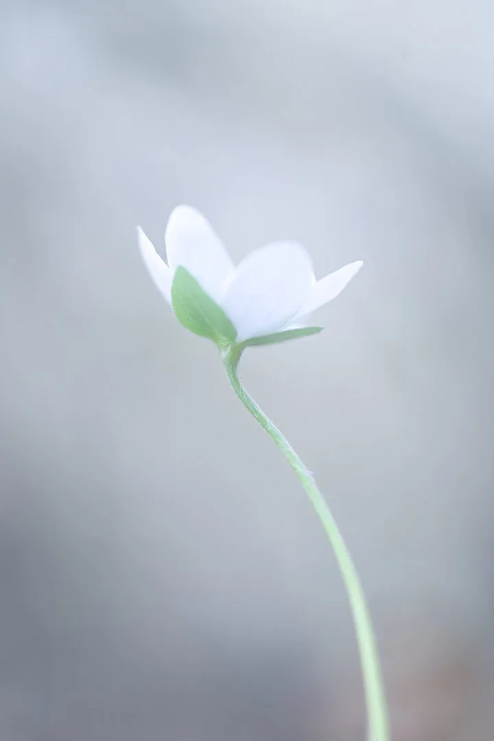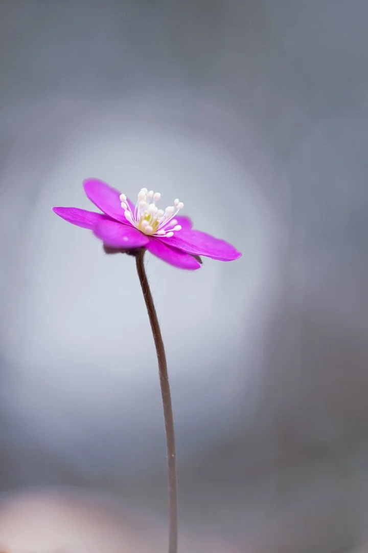 Eftersom mycket av detaljskärpan tonas ner behöver bildens form, färg och balans bära motivet. Jag valde därför att använda enkla, minimalistiska kompositioner där blomman får stå ensam i bildytan, omgiven av mycket negativ yta (ytor utan något direkt innehåll). Det ger motivet utrymme att andas och förstärker den luftiga, drömska känslan. Stjälkens linje får också en viktig roll i bilden genom att leda blicken upp mot blomman. Jag tycker att blombilder blir mycket bättre om de är tagna i blommornas höjd snarare än ner på dem, så jag fick lägga mig på marken när jag tog de här bilderna. Det är inte var dag man ligger på marken omgiven av vårblommor, faktiskt inte så illa!