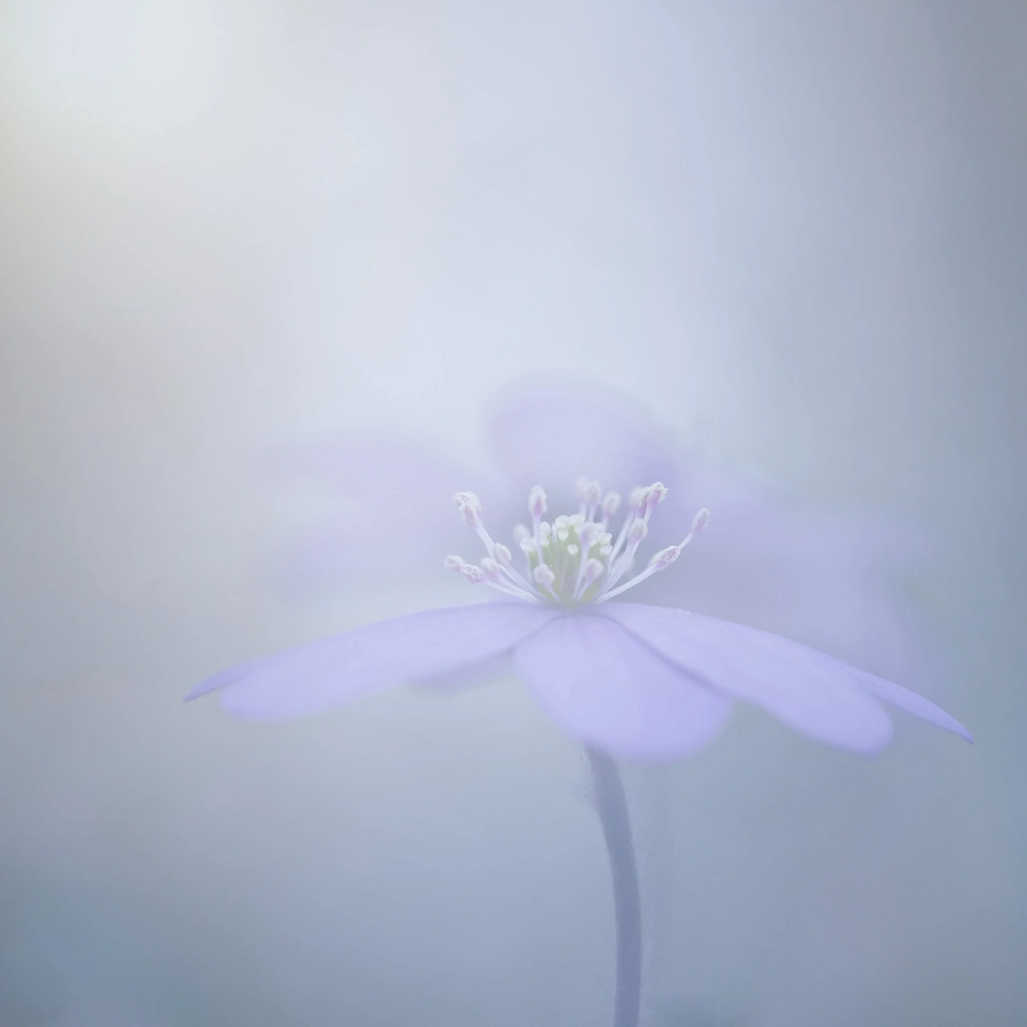 För att få den eteriska känslan har jag gjort en dubbelexponering. Den första bilden tog jag med ett kort skärpedjup men med fokus på blommans ståndare. Den andra bilden är själva nyckeln till känslan; jag vred objektivet helt ur fokus och riktade det mot en bakgrund som färgmässigt kompletterade blåsippan. Det blev som en dimma av ljus och färg som täckte den första bilden. Ett resultat jag aldrig hade kunnat få fram med en enda bild.