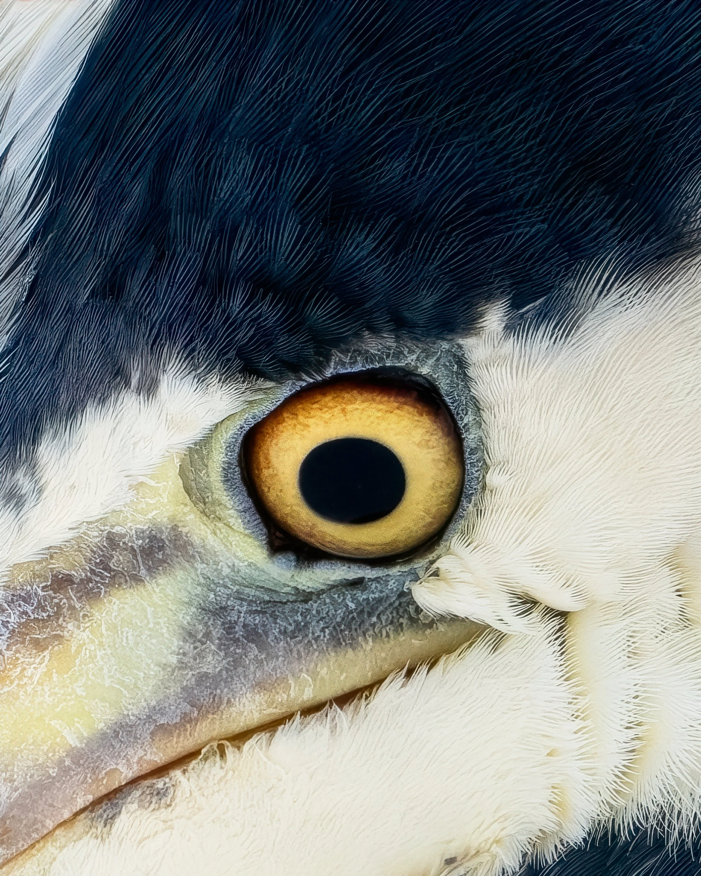 I just den här bilden har jag valt en mycket tajt och medvetet annorlunda beskärning. Genom att låta endast en del av fågelns huvud synas skapas ett oväntat uttryck. Ögat blir direkt bildens centrum, en tydlig ankarpunkt som fångar blicken. Den irisfärgen kontrasterar fint mot fjäderdräktens och näbbens svala gråvita toner.