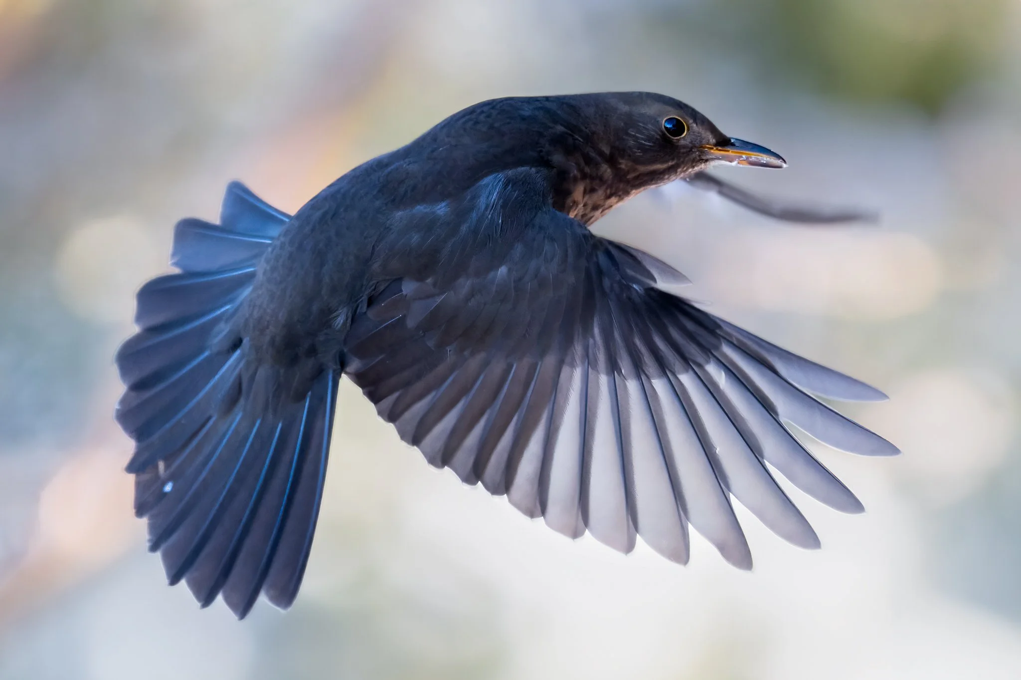 Det jag gillar med den här bilden är lättheten. Ljuset silas genom vingarna och gör fjäderdräkten nästan genomskinlig. Koltrasten som ofta upplevs som mörk och anonym, tycker jag här får en oväntad elegans. Utan det där speciella morgonljuset hade den bara varit en mörk silhuett, men nu löses bakgrunden upp i luftiga mjuka färger som låter fågeln spela huvudrollen. När bilden togs var det fortfarande snö på marken som fungerade som en reflektor som lättade upp den annars mörka fågeln.